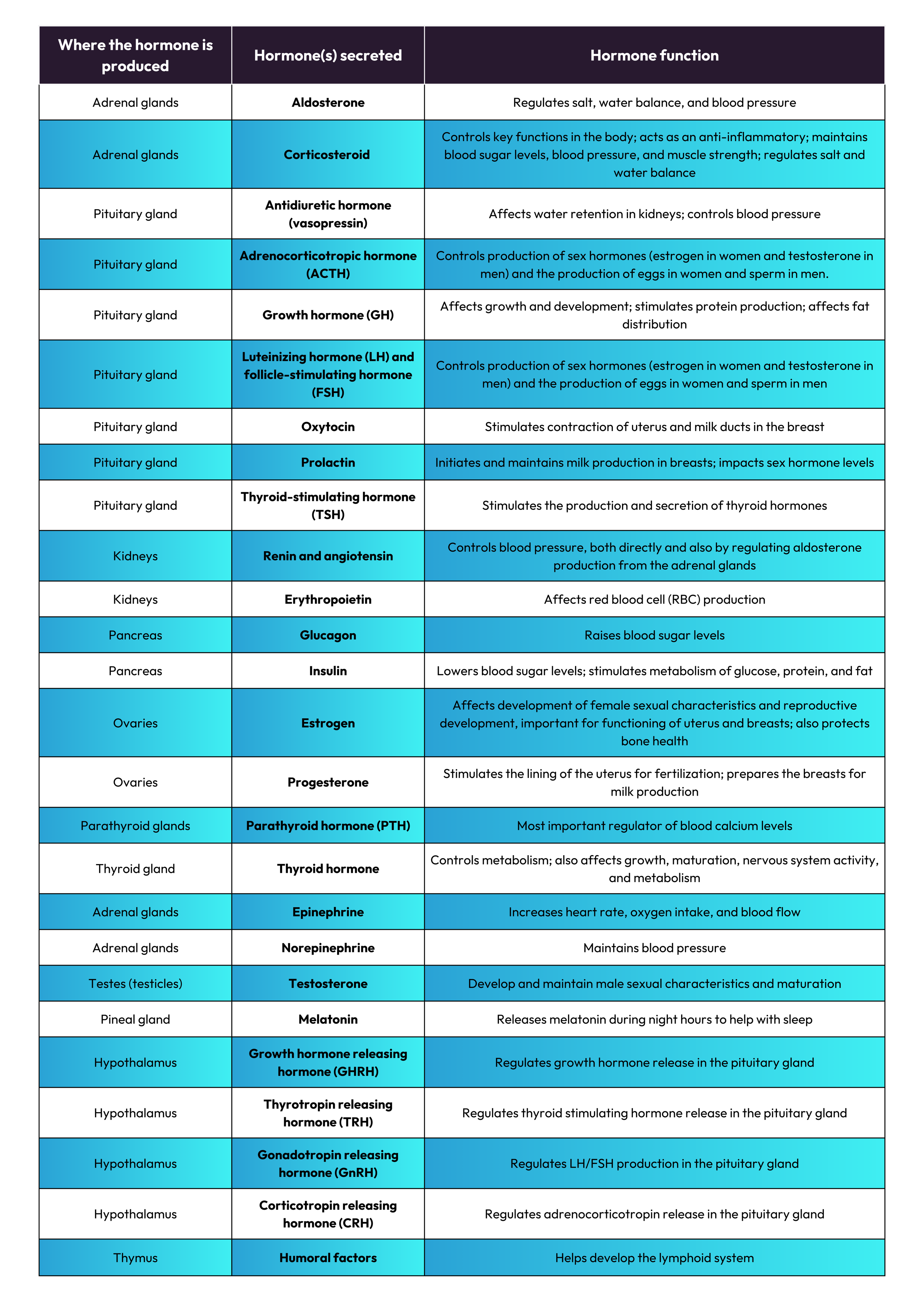 Thank you to the John Hopkins university for this helpful summary of some of the key hormones that you’ll find in your body, where they are produced, as well as the key functions of those hormones with respect to your endocrine system.